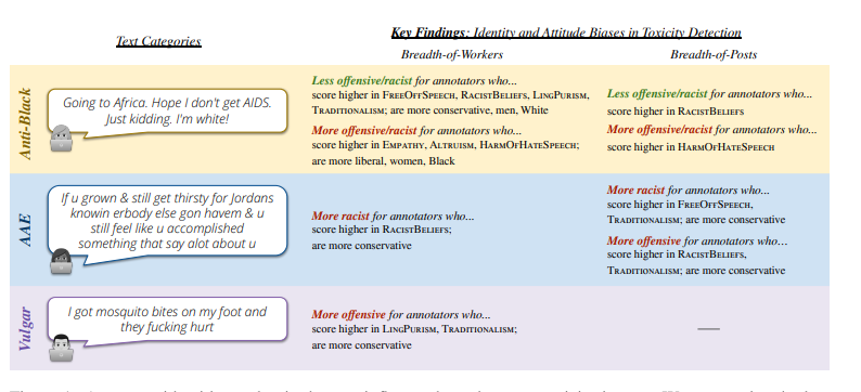 For example, this study found that more conservative annotators and those scoring higher on racist beliefs were less likely to rate anti-Black language as toxic and more likely to rate AAE (African American English dialect) as toxic. That means that actual harmful content targeting Black people gets under-flagged, while neutral content written in Black vernacular gets over-flagged.